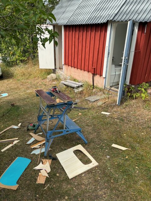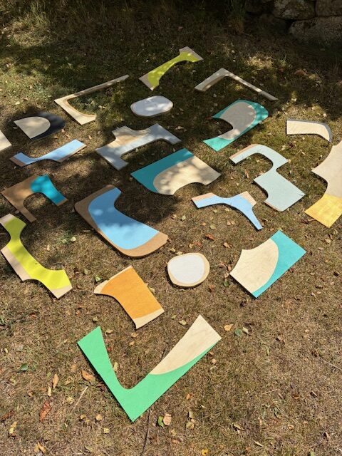 Vi arbejder på krydsfiner træ plader hvor vi skal lave organiske grafiske former som skabelon maling med forskellige farver. Vi tegner direkte på plader som er tapet ind i malertape. Tapen skæres fri og der males med malerruller.